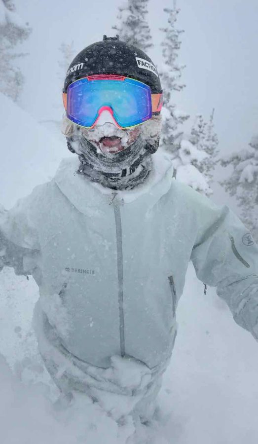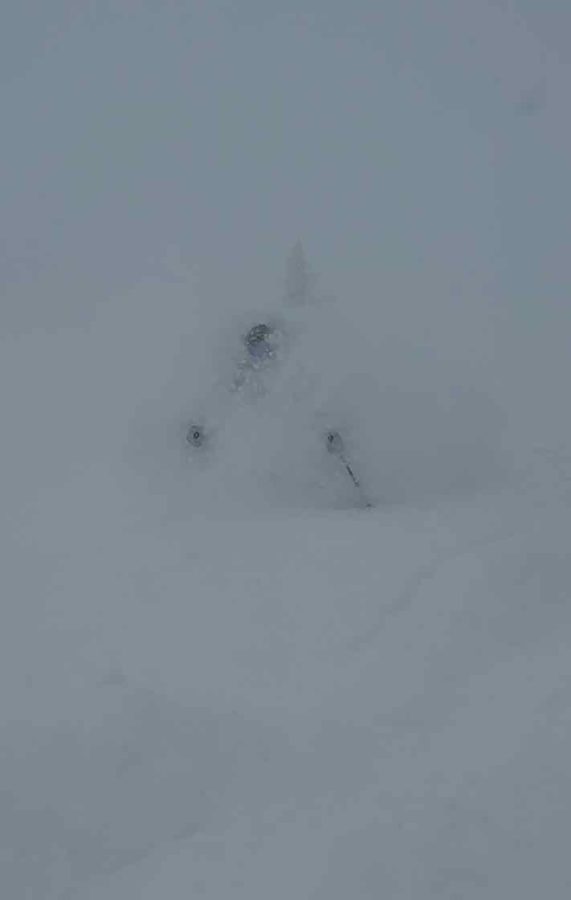It was a wild weather day as that Low pressure system moved over The Front overnight. The clouds were low and the freeze was light. With the visibility being marginal, staying with the prepared lines was the call. Mineral Basin was challenging to see during the day and thunder storms forced a couple of lightning holds on the hill. There were periods of heavy graupel falling that added a bit of variability to the pack.